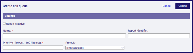 The Create call queue form offers many options for controlling your queue. While the only mandatory fields are Name, Priority, Project and Queue’s timeout, the other options let you create the kind of behaviour that suits your needs.
