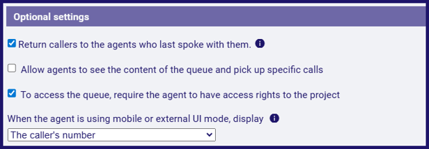 - If the caller calls back within the 'Preferred agent duration' (a setting in projects), you may wish to route the call back to the same agent, if they are available. If you do, click to tick Return callers...