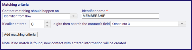 - To handle this, you would use a matching criteria to look at the Other info 3 field to check the membership number if the caller typed 8 digits,