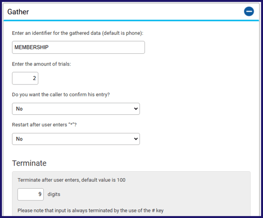 - In the Terminate section, type the number of digits you expect the caller to enter. The caller can always end their input before this limit is reached by pressing #.